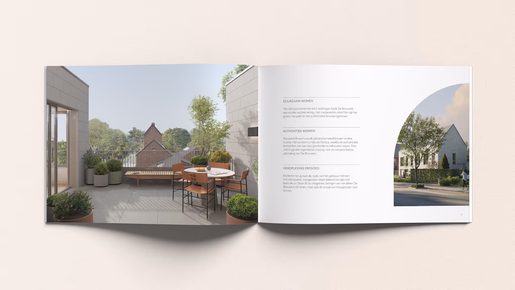 Deze branding trokken we door in verschillende grafische toepassingen, zodat de uitstraling van De Brouwerij consistent werd doorgetrokken. We ontwierpen een brochure, folder, een projectmap die gebruikt kan worden om het project aan geïnteresseerden voor te stellen, en creëerden een Word-template voor hun lastenboek. Zo zorgden we ervoor dat de branding niet alleen helder en herkenbaar is, maar ook doorlopend terugkomt in al hun communicatiemiddelen.